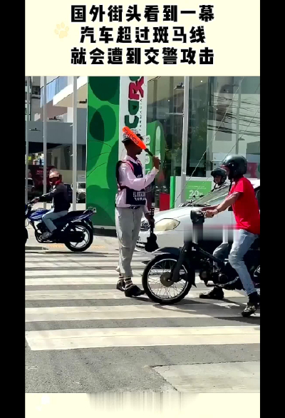 國外街頭看到一幕,汽車超過斑馬線,就會遭到交警攻擊!