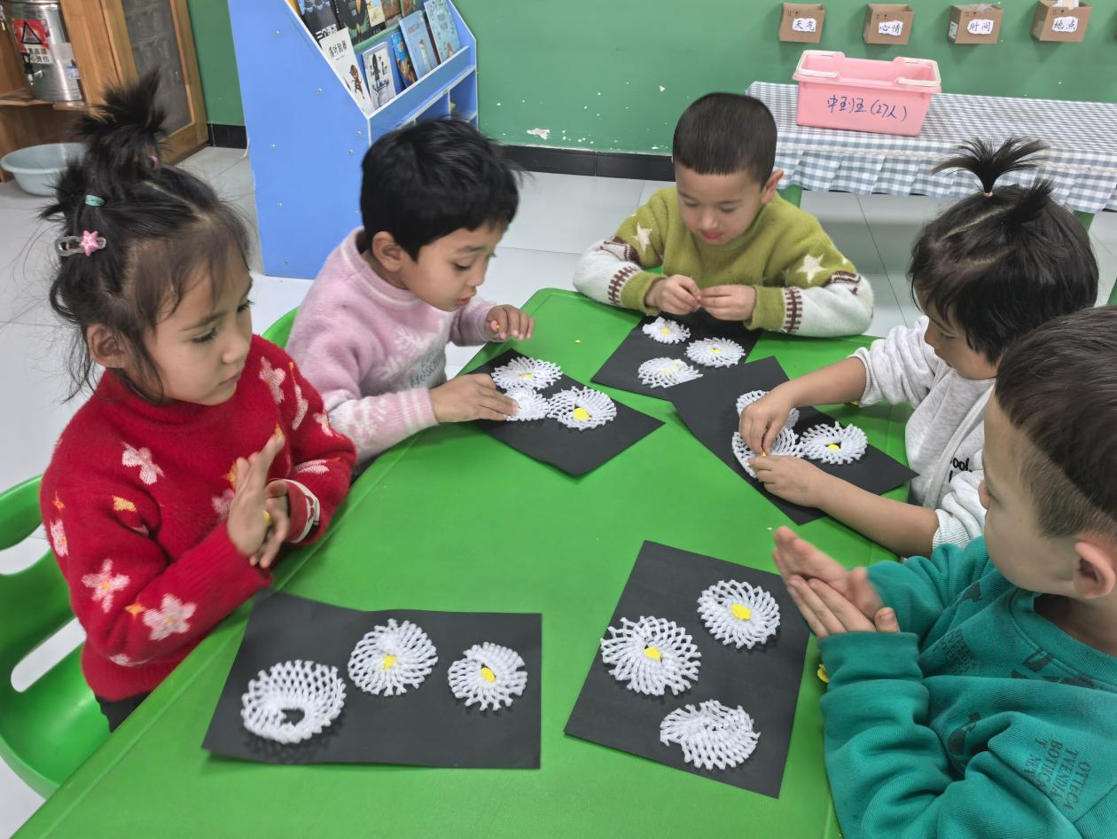 溫宿縣托甫汗鎮(zhèn)中心幼兒園的孩子們在老師的帶領下制作菊花,表達對逝者哀思。(胡云飛 攝)