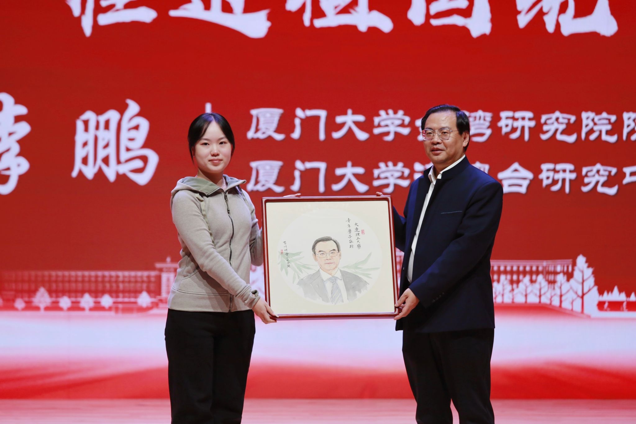 學(xué)校團(tuán)委書記趙顯嵩代表學(xué)校為李鵬頒發(fā)“百川講堂”紀(jì)念牌,學(xué)生代表贈(zèng)送國(guó)畫肖像,以表感謝與敬意。