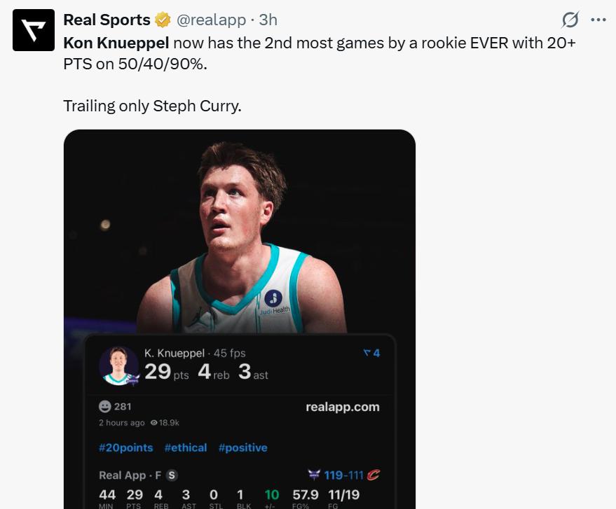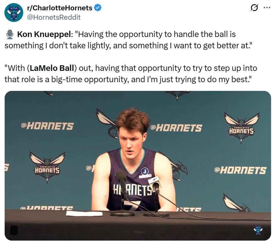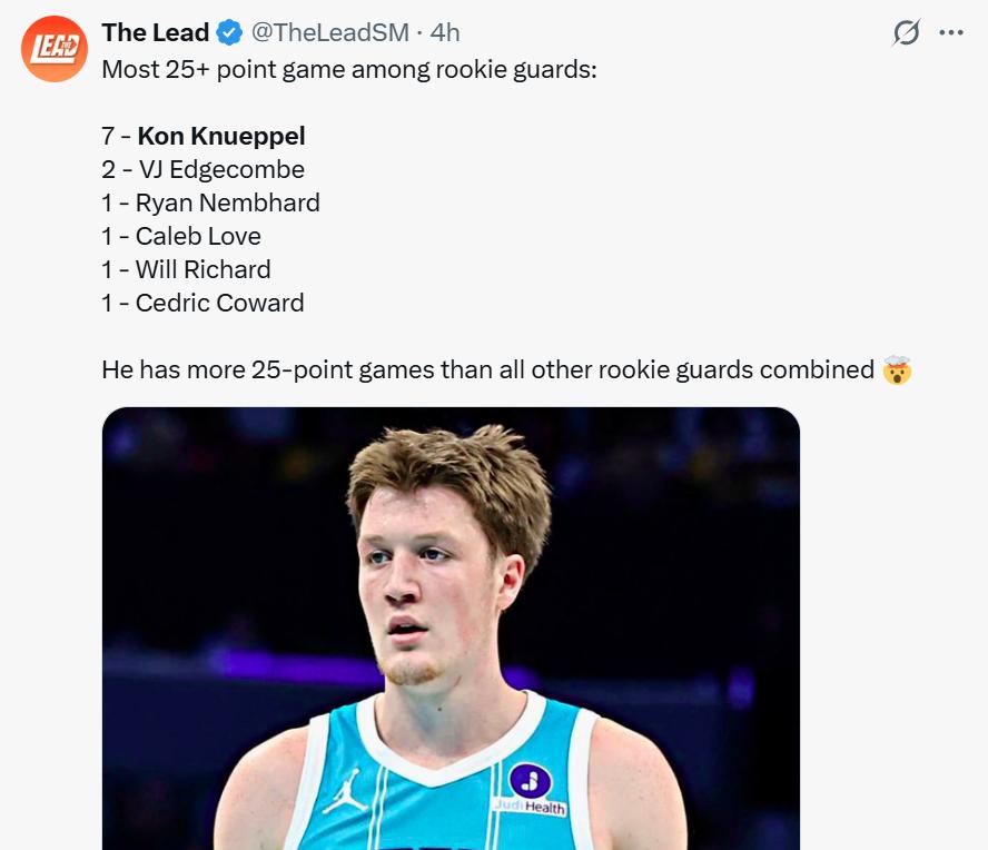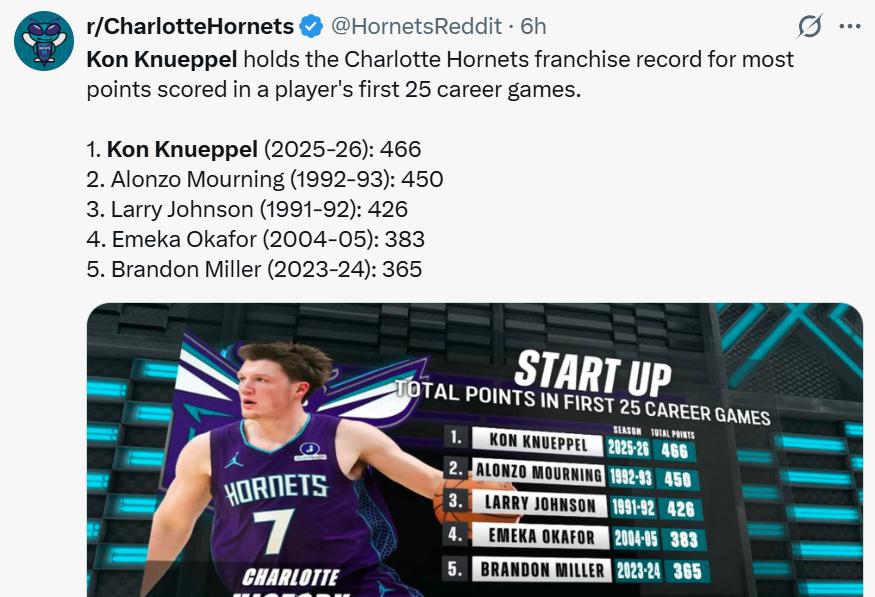 本場拿下29分后,克努佩爾在生涯前25場比賽中已經拿到466分,超越莫寧位列黃蜂新秀前25場得分總和隊史第一。