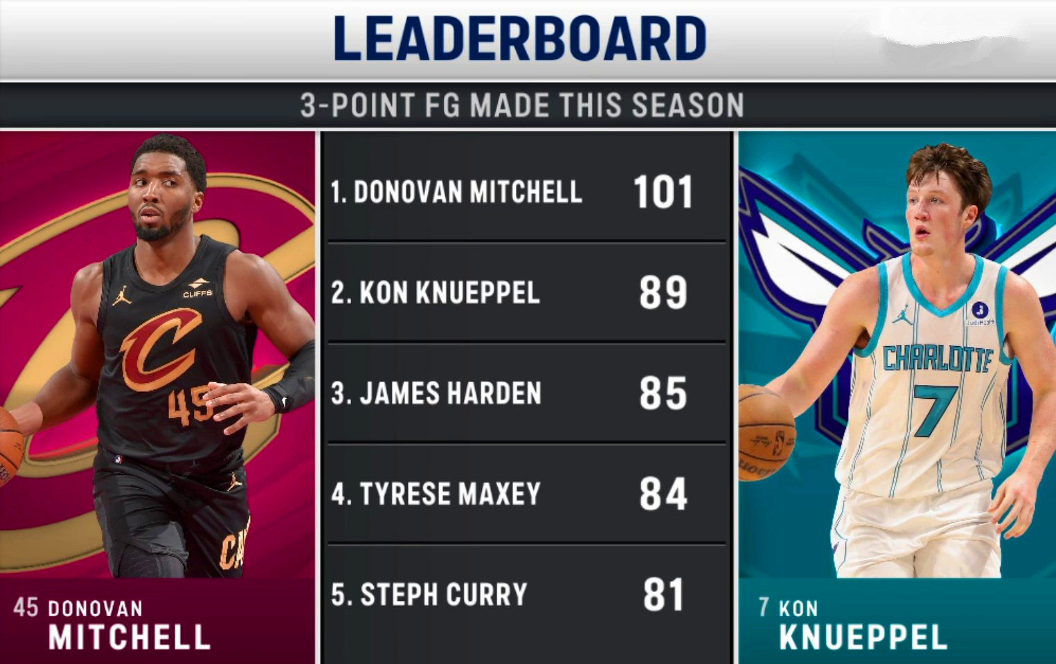 而本場命中3記三分之后,克努佩爾本賽季已經命中89記三分,高居聯盟第二,僅次于米切爾的101記。