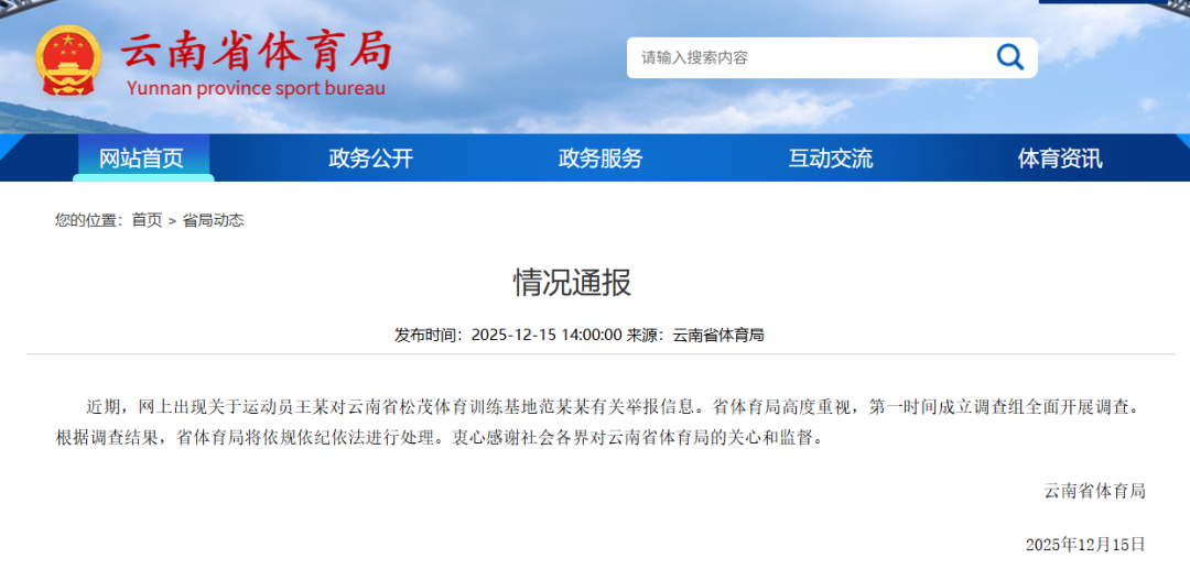 近期,網上出現關于運動員王某對云南省松茂體育訓練基地范某某有關舉報信息。省體育局高度重視,第一時間成立調查組全面開展調查。根據調查結果,省體育局將依規依紀依法進行處理。衷心感謝社會各界對云南省體育局的關心和監督。