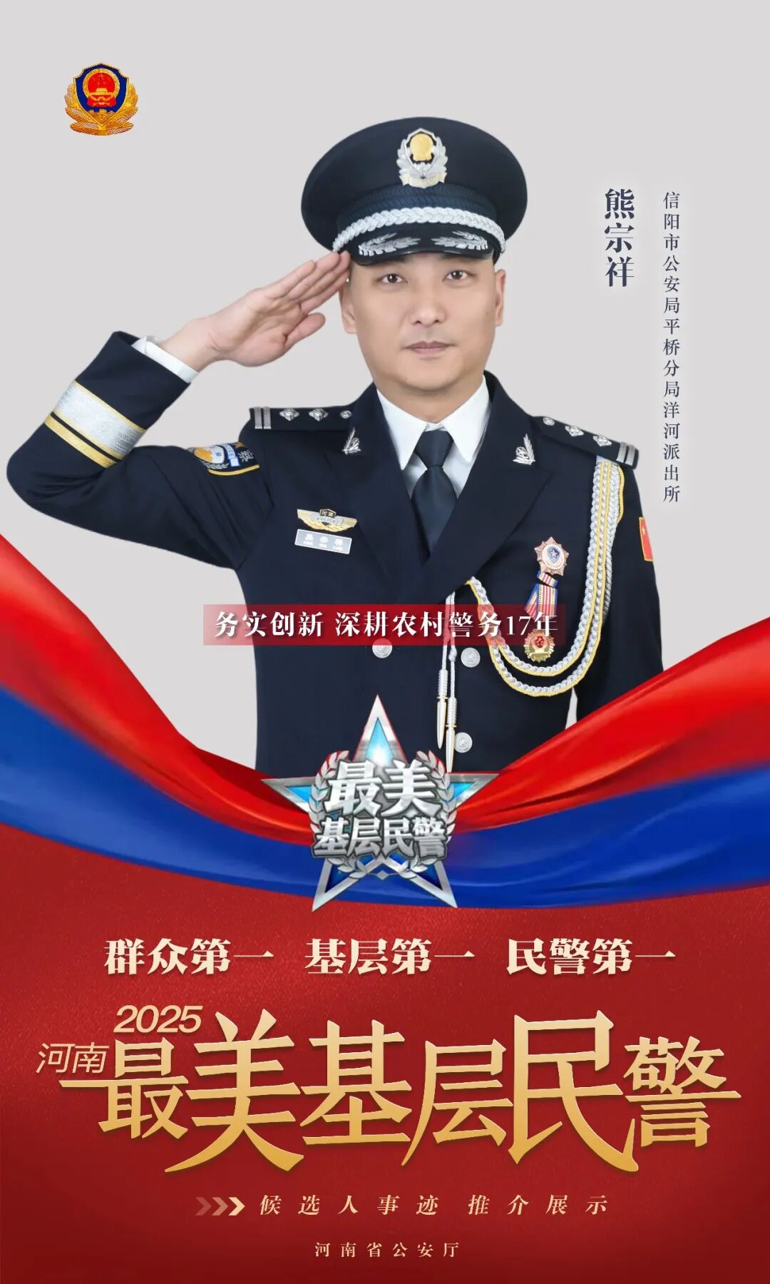 熊宗祥,今年42歲,信陽市公安局平橋分局洋河派出所所長。2008年參加公安工作,十七年來,他始終扎根在基層農村派出所,把最美好的青春年華播撒在鄉間田野。先后榮立個人三等功1次,多次獲省、市先進個人。洋河派出所榮立集體三等功2次,被授予“公安部一級公安派出所”“全省楓橋式公安派出所”等榮譽稱號。