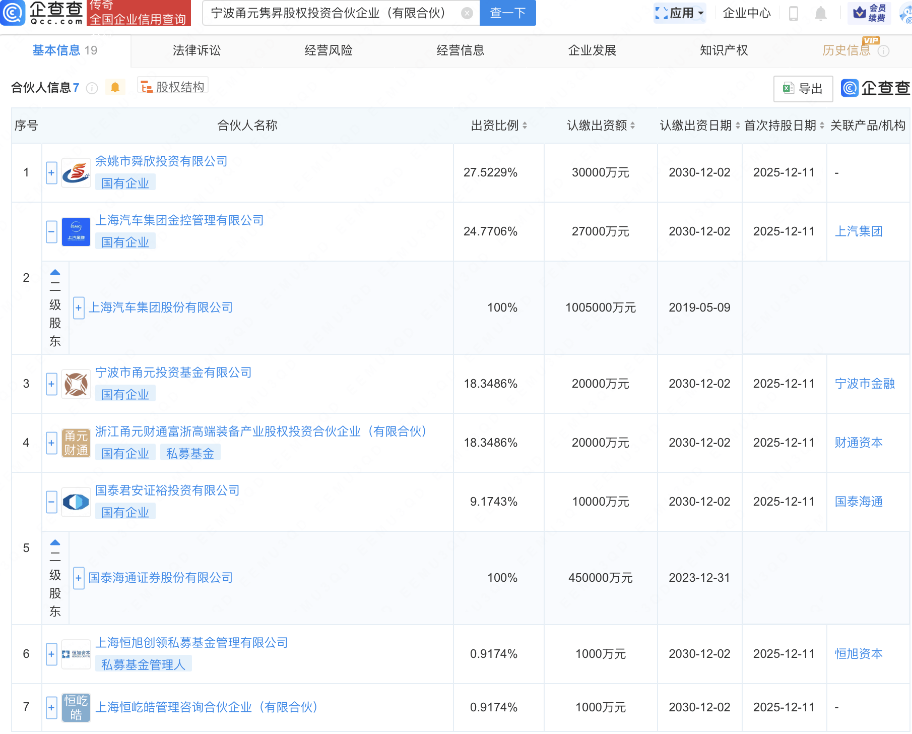 企查查APP顯示,近日,寧波甬元雋昇股權投資合伙企業(有限合伙)成立,出資額10.9億元,經營范圍包含:以私募基金從事股權投資、投資管理、資產管理等活動。企查查股權穿透顯示,該企業由上汽集團(600104)全資子公司上海汽車集團金控管理有限公司、國泰海通(601211)全資子公司國泰君安證裕投資有限公司等共同持股。