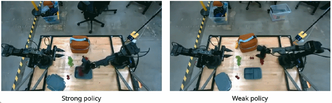 研究中,作者還使用 Veo(Robotics)模型,對 8 個不同版本的 VLA 機器人策略進行性能預測,然后把這些預測結果與機器人在真實世界中的實際測試結果進行對比,以檢驗視頻模型預測是否準確、可靠。如下 demo 展示了 Veo(Robotics)針對兩種策略的實際運行示例。