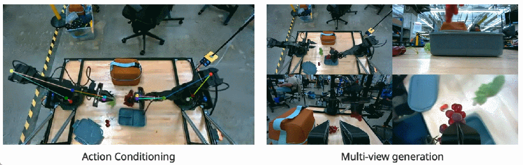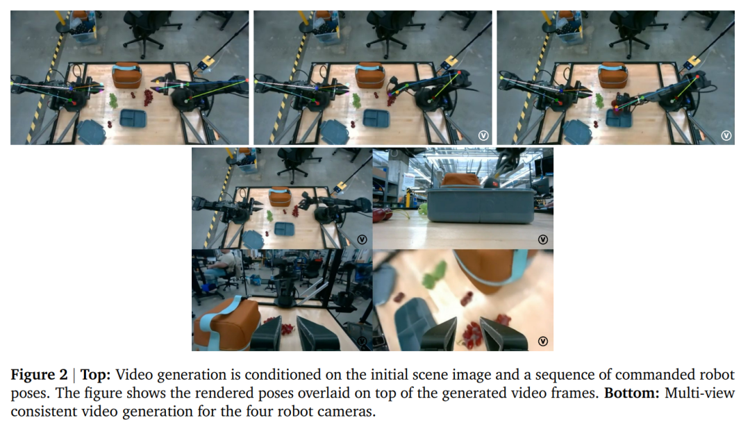 最后,為減輕部分觀測帶來的影響,本文將系統中的四個相機視角(包括俯視視角、側視視角,以及左右腕部視角)拼接成一個整體輸入。然后對 Veo2 進行微調,使其能夠在給定初始幀和未來機器人位姿的條件下,生成這種拼接后的多視角未來幀。圖 2(下)展示了一個由該模型生成的多視角視頻幀示例。