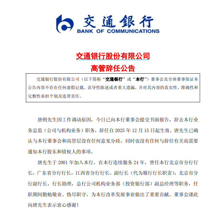 【大河財立方消息】12月15日,交通銀行公告,唐朔因工作調動原因,已向董事會提交書面報告,辭去業務總監(公司與機構業務)職務,辭任自12月15日起生效。