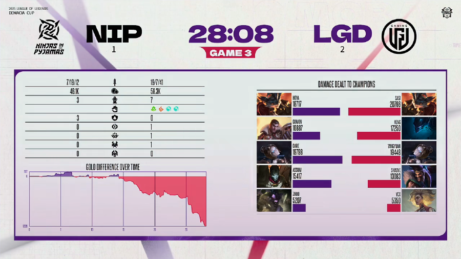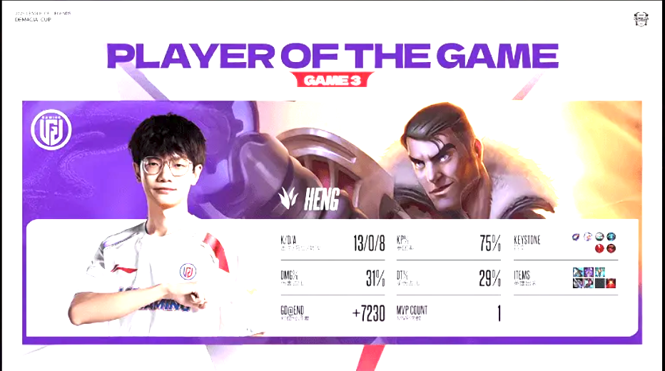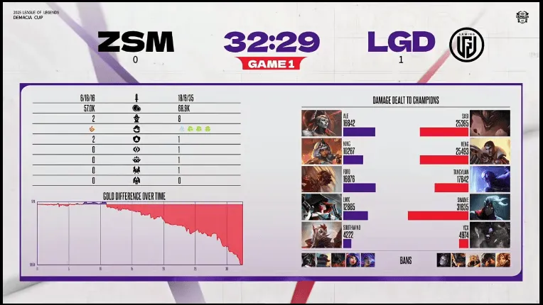 最終LGD在掉線的情況下,以二比一,戰勝ZSM,取得2025德瑪西亞杯的首勝。