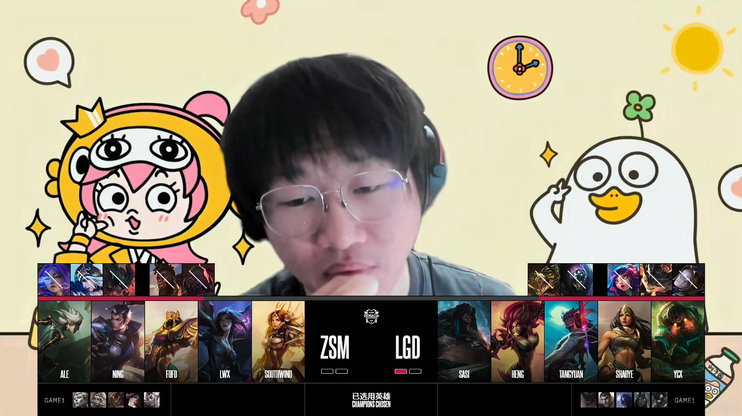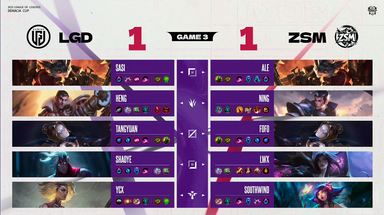 第一局比賽,ZSM藍色方,禁用:蕓阿娜、妮蔻、劍魔、布隆、列娜塔,選用:Ale亞恒、Ning奇亞娜、、FoFo巖雀、LWX女槍、Southwind洛;LGD紅色方,禁用:發條、蘭博、沙皇、泰坦、日女,選用:Sasi石頭人、Heng杰斯、Tangyuan瑞茲、Shaoye維魯斯、YCX牛頭