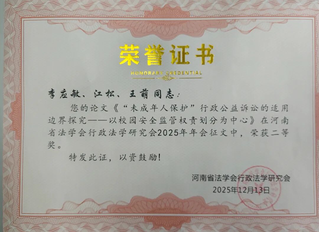 12月13日,河南省法學(xué)會行政法學(xué)研究會2025年年會在鄭州召開。寶豐法院李應(yīng)敏、江松、王萌同志撰寫的《“未成年人保護”行政公益訴訟的適用邊界探究——以校園安全監(jiān)管權(quán)責(zé)劃分為中心》一文斬獲二等獎并受邀參加學(xué)術(shù)研討,同時李應(yīng)敏受邀作為實務(wù)界代表參與專題與談,充分展現(xiàn)了寶豐法院干警扎實的專業(yè)素養(yǎng)與深厚的理論功底。這份榮譽的背后,更是寶豐法院持續(xù)推進學(xué)習(xí)型法院建設(shè)的堅定實踐。