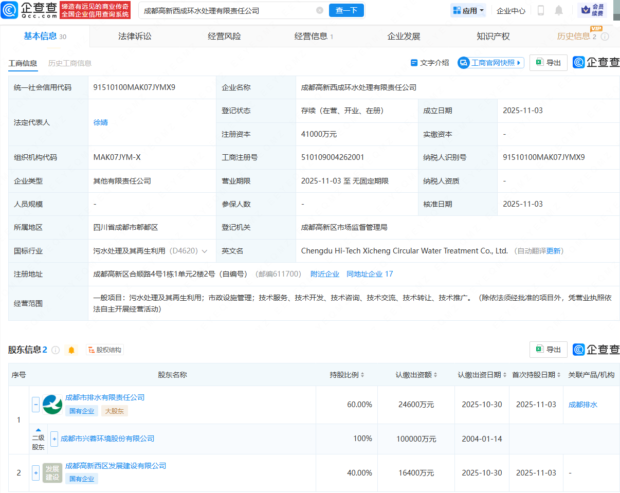 企查查APP顯示,近日,成都高新西成環(huán)水處理有限責(zé)任公司成立,法定代表人為徐婧,注冊(cè)資本為4.1億元,經(jīng)營(yíng)范圍包含:污水處理及其再生利用;市政設(shè)施管理等。企查查股權(quán)穿透顯示,該公司由興蓉環(huán)境(000598)全資子公司成都市排水有限責(zé)任公司、成都高新西區(qū)發(fā)展建設(shè)有限公司共同持股。