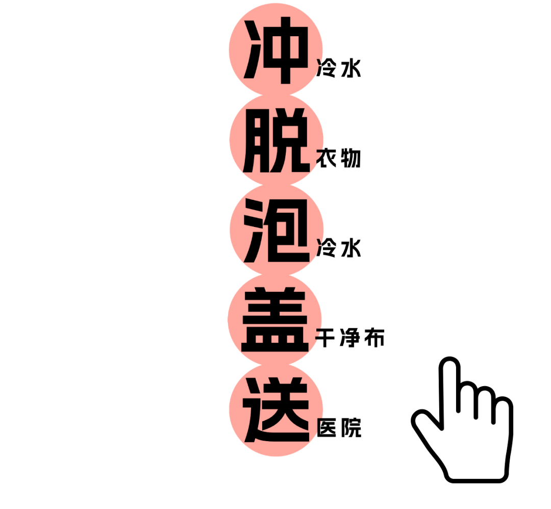 沖:盡快用潔凈冷水(15℃-20℃)至少沖洗傷處20分鐘;