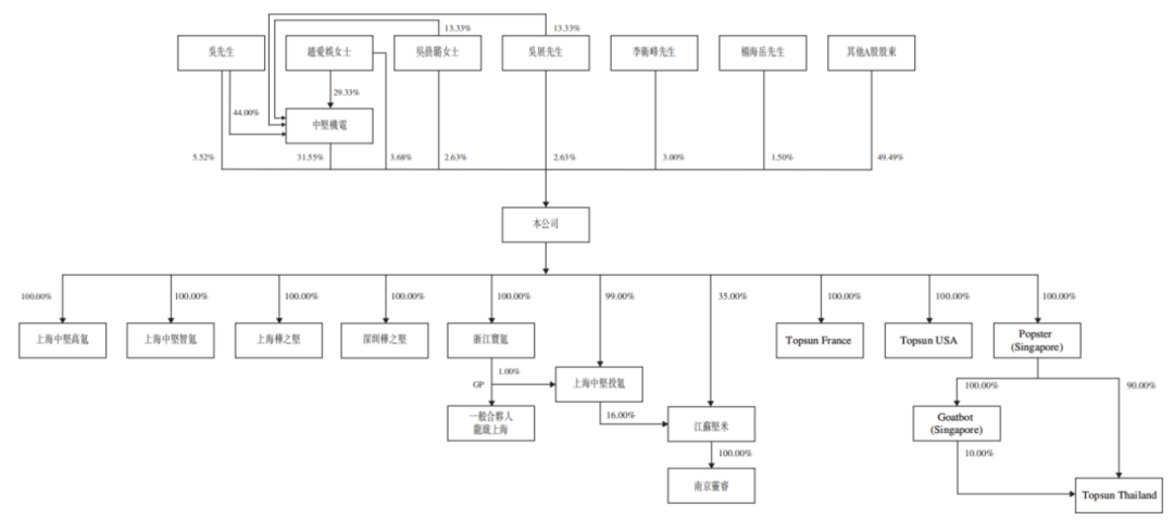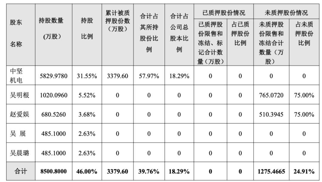 其中,趙愛(ài)娛是吳明根的配偶,吳晨璐、吳展分別是吳明根和趙愛(ài)娛的女兒和兒子,中堅(jiān)機(jī)電則由吳明根一家四口持有。其余個(gè)人股東均為公司高管。