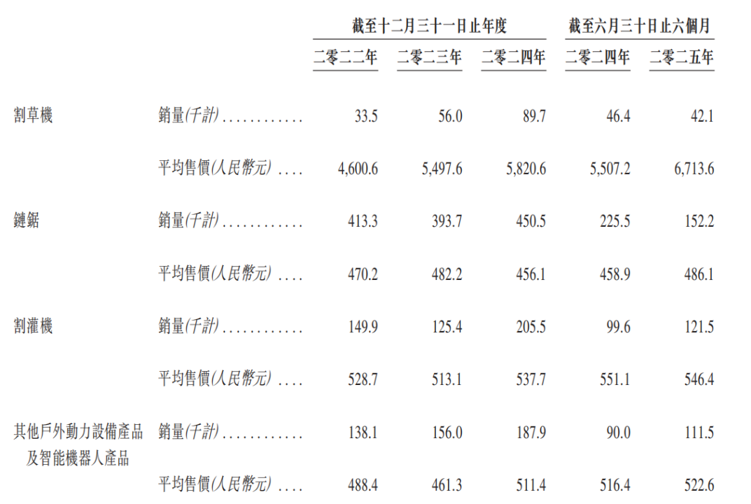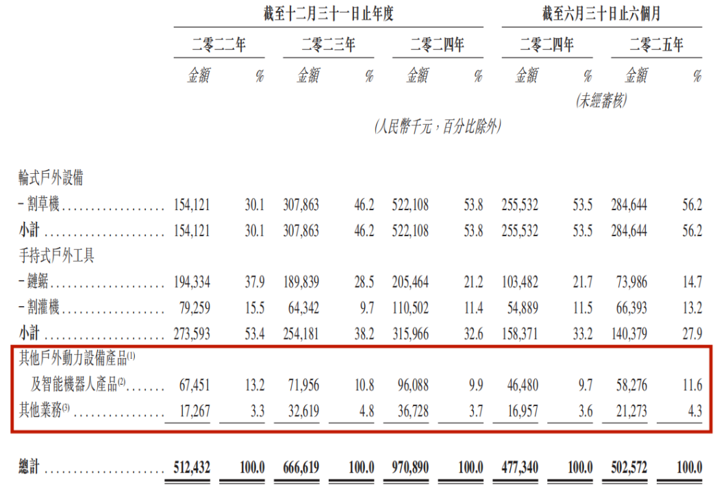 2024年及2025年上半年,公司2.52億元及1.49億元的毛利中,其他戶外動(dòng)力設(shè)備產(chǎn)品及智能機(jī)器人產(chǎn)品占比也分別有9.45%、11.11%。