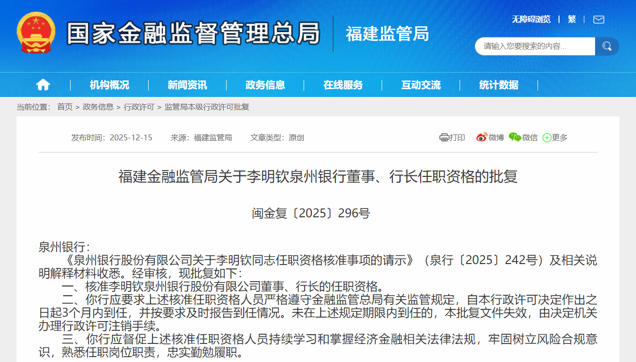 瑞財經 王敏 12月15日,福建金融監管局批復,核準李明欽泉州銀行股份有限公司(以下簡稱“泉州銀行”)董事、行長的任職資格。