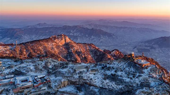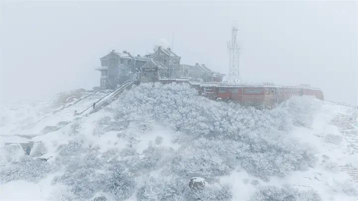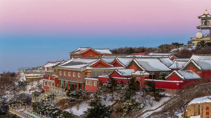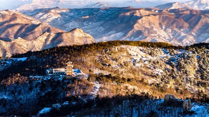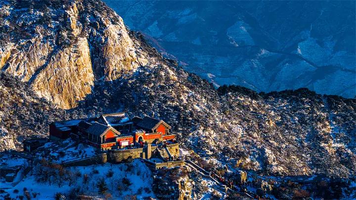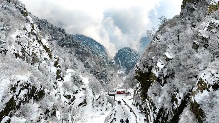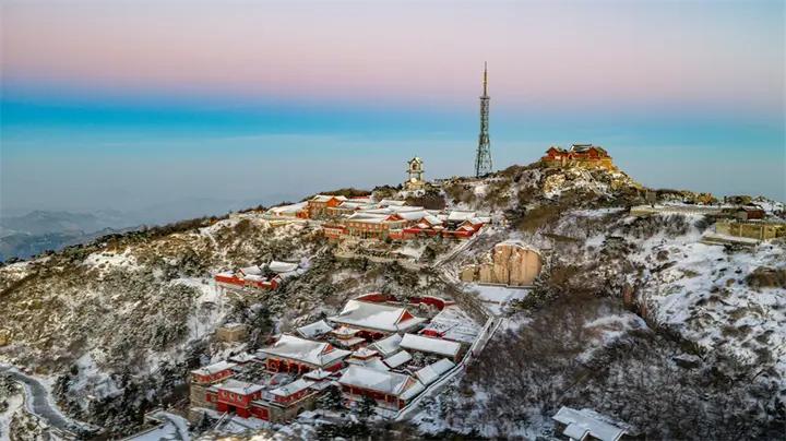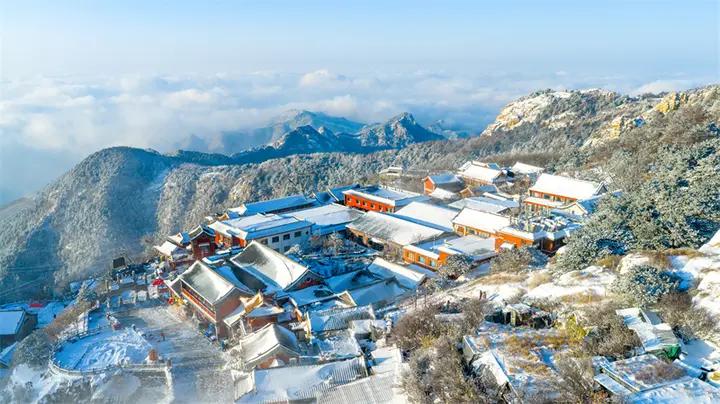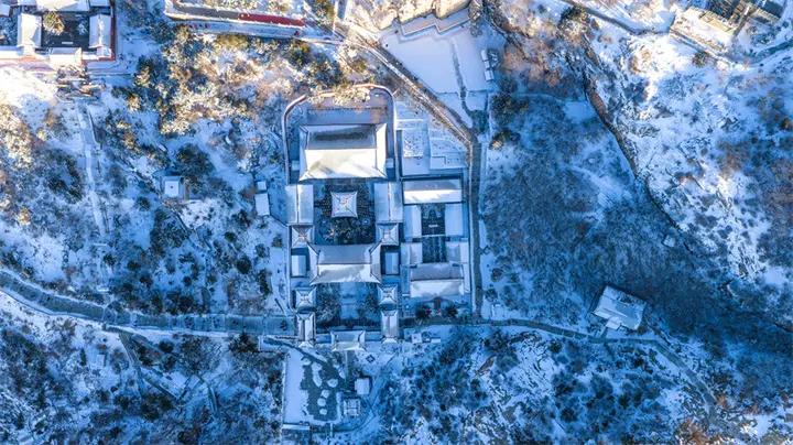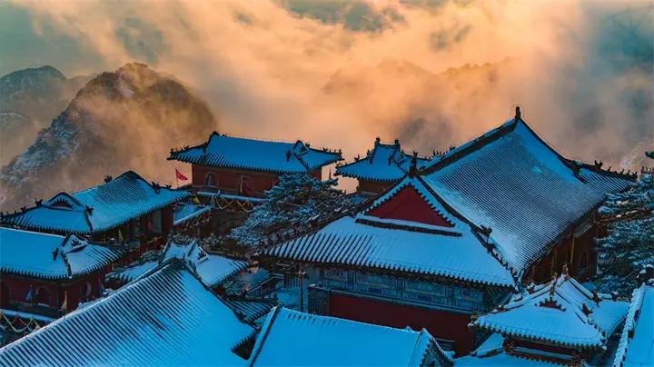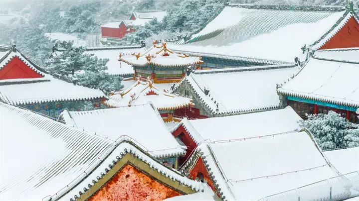 白雪覆蓋千峰萬壑,峰巒在云霧中若隱若現,宛如水墨長卷徐徐展開。山間古松玉樹瓊枝,松針托著蓬松積雪隨風輕晃;紅墻黛瓦的古建筑群被白雪包裹,覆雪的殿宇樓閣飛檐翹角,宛若天宮瓊樓玉宇落于人間,朱紅宮墻點綴其間,更添幾分雅致與莊嚴。