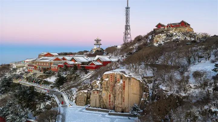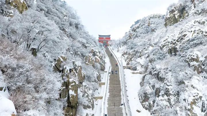 降雪過后,泰山換上銀白盛裝化作瓊樓玉宇的冬日仙境,限定美景引得游人沉醉。