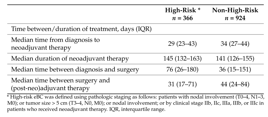對(duì)于接受新輔助治療的高危HER2+ eBC患者,從診斷到開始新輔助治療的中位時(shí)間為29天,略短于非高風(fēng)險(xiǎn)組的34天。新輔助治療的中位持續(xù)時(shí)間在高風(fēng)險(xiǎn)組中為145天,也略長于非高風(fēng)險(xiǎn)組的141天。此外,在整體人群中,高風(fēng)險(xiǎn)組從診斷到手術(shù)的中位間隔時(shí)間相較于非高危組更長(76天 vs 36天),這提示了其在新輔助階段接受了更長時(shí)間的系統(tǒng)性治療。