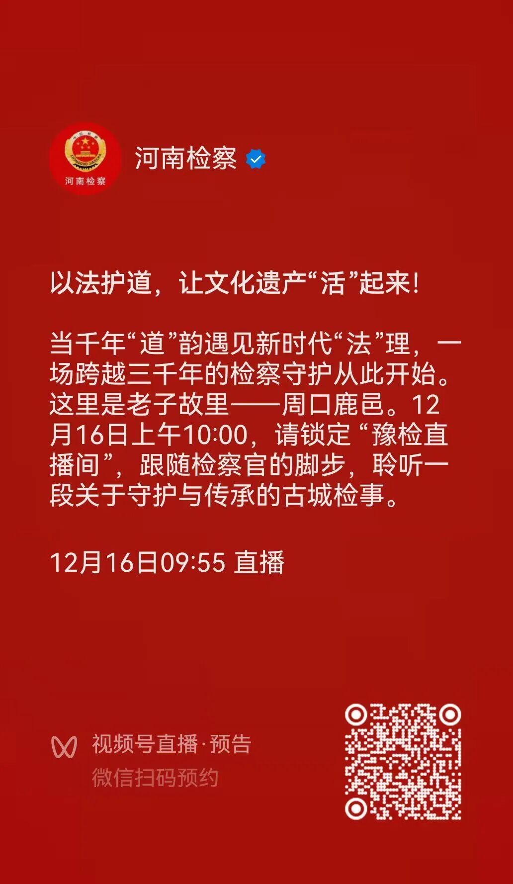 當千年“道”韻遇見新時代“法”理,一場跨越三千年的檢察守護從此開始。這里是老子故里——周口鹿邑。“人法天,天法地,地法道,道法自然”,古老的智慧在此生根。而今,檢察機關“以法護道”正在這里寫下新的篇章。12月16日上午10:00,敬請鎖定 “豫檢直播間”,跟隨檢察官的腳步,一起聆聽一段關于守護與傳承的古城檢事。