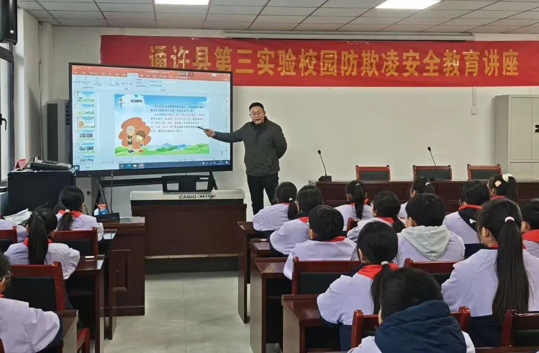在通許第三實驗中學,通許縣司法局社區矯正中心主任馮杰以法治副校長的身份,為在校師生帶來一場以“對校園欺凌說‘不’”為主題的精彩法治講座。