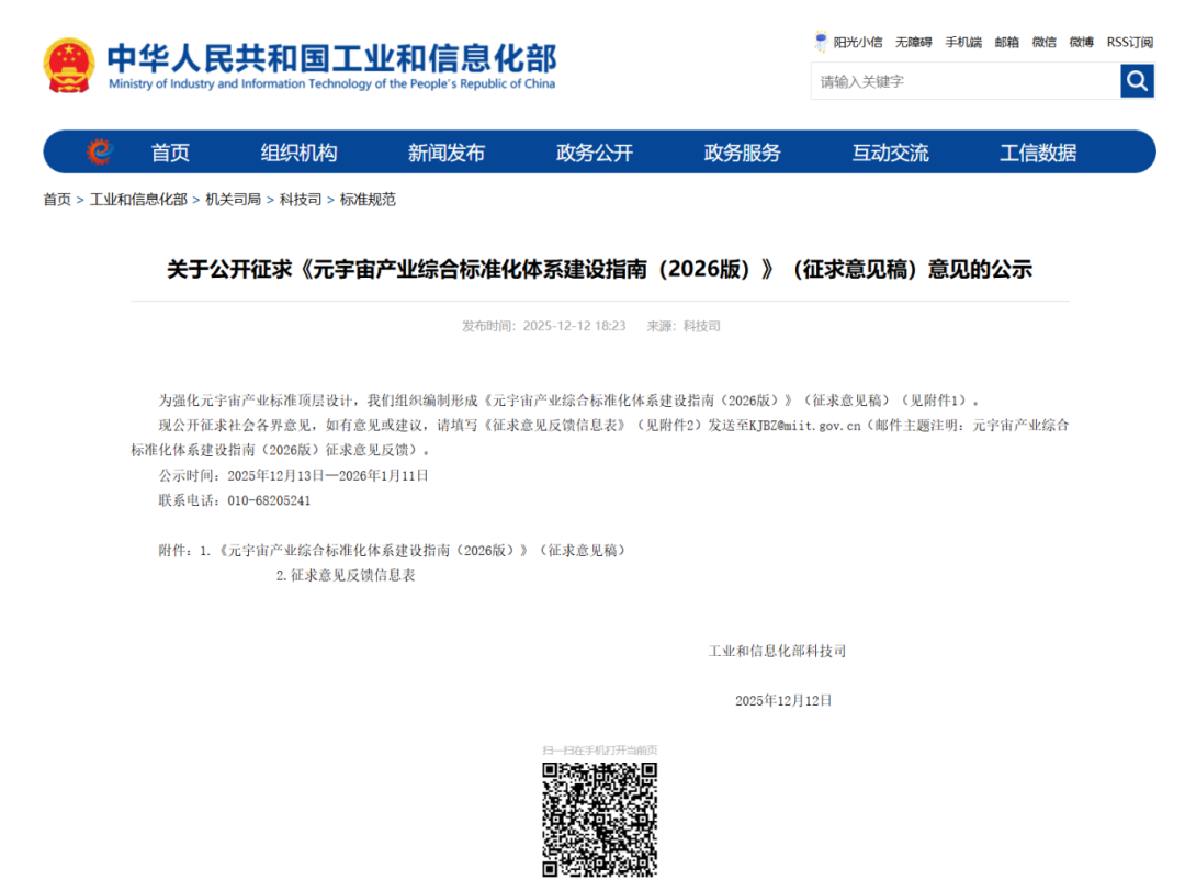 為強化元宇宙產業標準頂層設計,我們組織編制形成《元宇宙產業綜合標準化體系建設指南(2026版)》(征求意見稿)(見附件1)。
