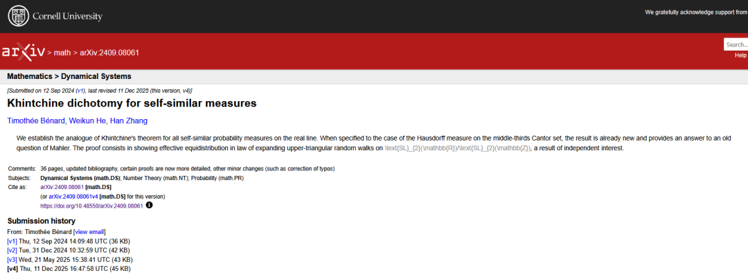 學(xué)校青年教師張涵、中國數(shù)學(xué)與系統(tǒng)科學(xué)研究院副研究員何偉鯤、巴黎第十三大學(xué)Timothée Bénard三人合作,在該成果中把辛欽定理推廣至實(shí)軸上任意自相似測度的情形。Kurt Mahler關(guān)于三分康托集的公開問題作為該成果的一個特例被解決。這項(xiàng)工作結(jié)合了分形幾何的工具、隨機(jī)游走理論以及齊性空間動力系統(tǒng)理論,通過建立特殊齊性空間上的分形軌道有效等分布定理完成了對辛欽定理的推廣。