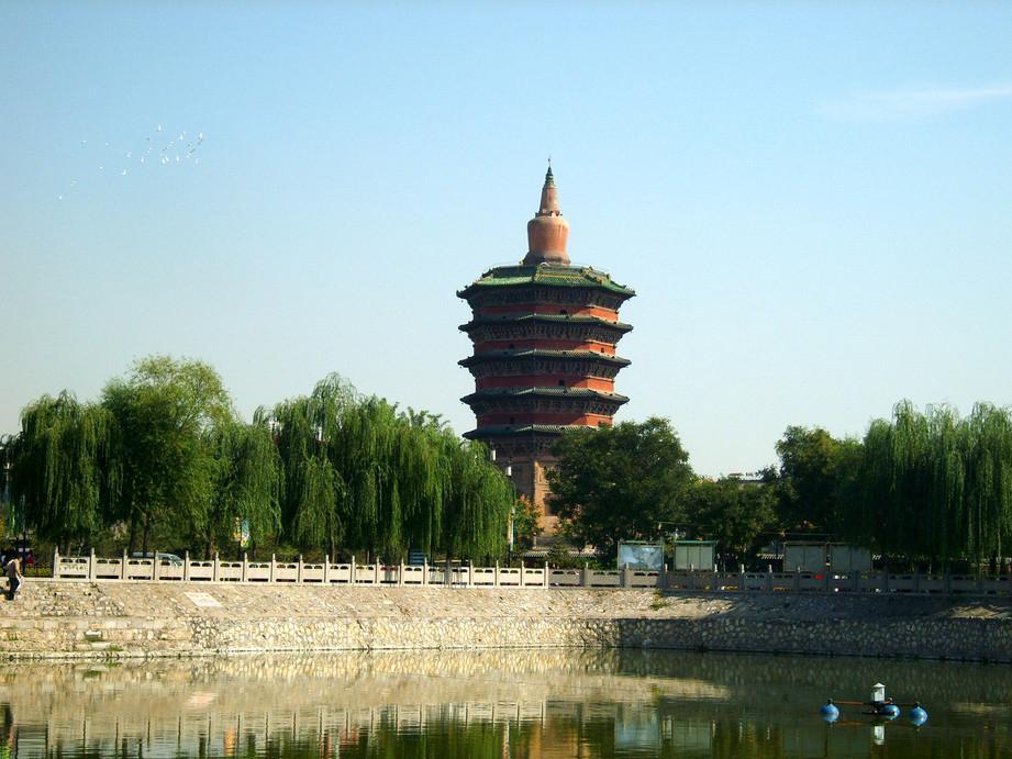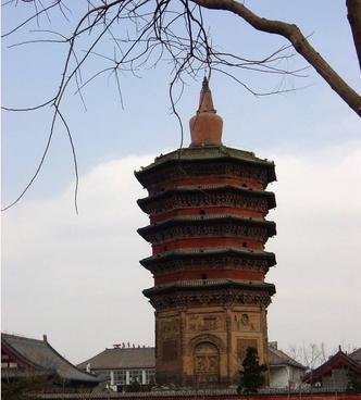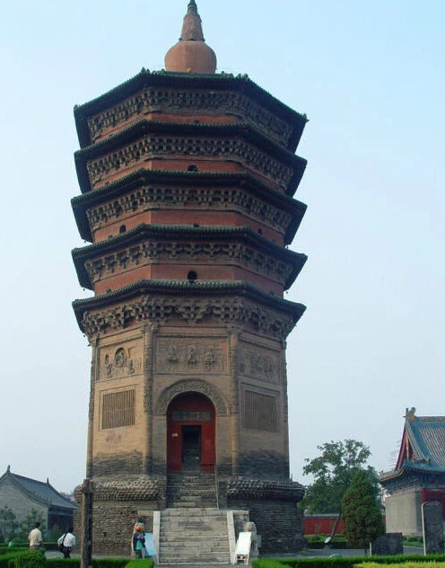 文峰塔建于五代后周廣順二年,已有一千余年歷史。文峰塔五層八面,由塔基、塔身、塔剎三部分組成。浮屠五級上有平臺,下有券門,每層周圍有小園窗。塔坐落在一個高達二公尺的磚砌臺基上。文峰塔的建筑,富有獨特的風格,具有上大下小的特點。由下往上一層大于一層,逐漸寬敞,是傘狀形式,這種平臺、蓮座、遼式塔身、藏式塔剎的形制世所罕見。