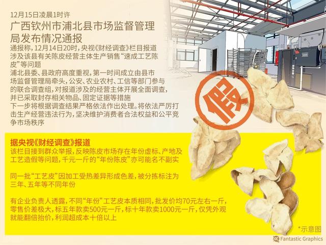 據央視《財經調查》欄目報道,為了追逐暴利,部分商家將廉價的茶枝柑鮮果剝皮后,用上了名為 “輕工藝” 的造假手段。通過黑科技把原本需要自然陳化三年以上才能稱得上 “陳皮” 的柑皮,僅用一個月就被加工成外觀酷似三到五年陳化的 “工藝皮”。