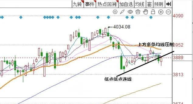第二條理由也很直白,周五雖然以反彈收盤,但早盤是下跌的,早盤拋盤發動攻擊,多頭是被動回擊才拿回局面,這說明短線主動權并不在多頭,另外上邊壓著好幾條均線,還有那條之前低點連線被跌破后變成的“壓力線”,你以為收了個反彈就天下大平,太天真了。