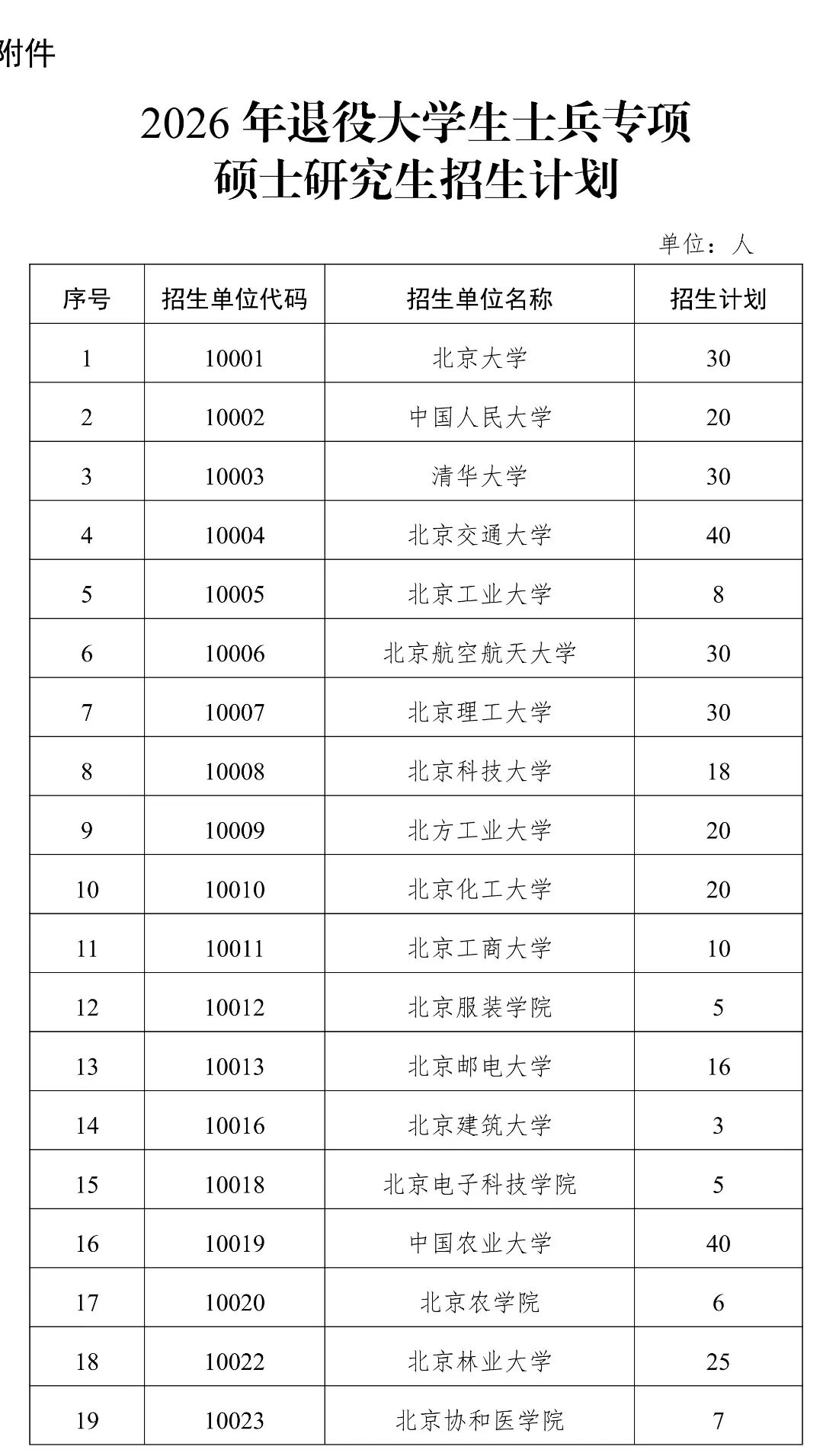 “退役大學(xué)生士兵計(jì)劃”是全國碩士研究生招生工作的重要組成部分,在全國碩士研究生招生計(jì)劃總規(guī)模內(nèi)單列下達(dá)、專項(xiàng)使用,不得調(diào)整為普通計(jì)劃或其他專項(xiàng)計(jì)劃。招生單位自主確定“退役大學(xué)生士兵計(jì)劃”考生初試成績要求(一般不高于本單位相應(yīng)學(xué)科專業(yè)普通計(jì)劃考生初試成績要求)、該計(jì)劃接受考生調(diào)劑的初試成績要求。同等條件下服役時(shí)間長的考生優(yōu)先錄取。專項(xiàng)計(jì)劃未完成的招生單位應(yīng)積極組織調(diào)劑工作,接受符合條件的考生報(bào)考。2026年全國“退役大學(xué)生士兵計(jì)劃”由北京大學(xué)、清華大學(xué)等532所普通高等學(xué)校承擔(dān)(招生單位名單見附件)。各招生單位要因校制宜合理確定“退役大學(xué)生士兵計(jì)劃”招生專業(yè)范圍,在碩士研究生考試招生專業(yè)目錄中予以明確并對外公布。