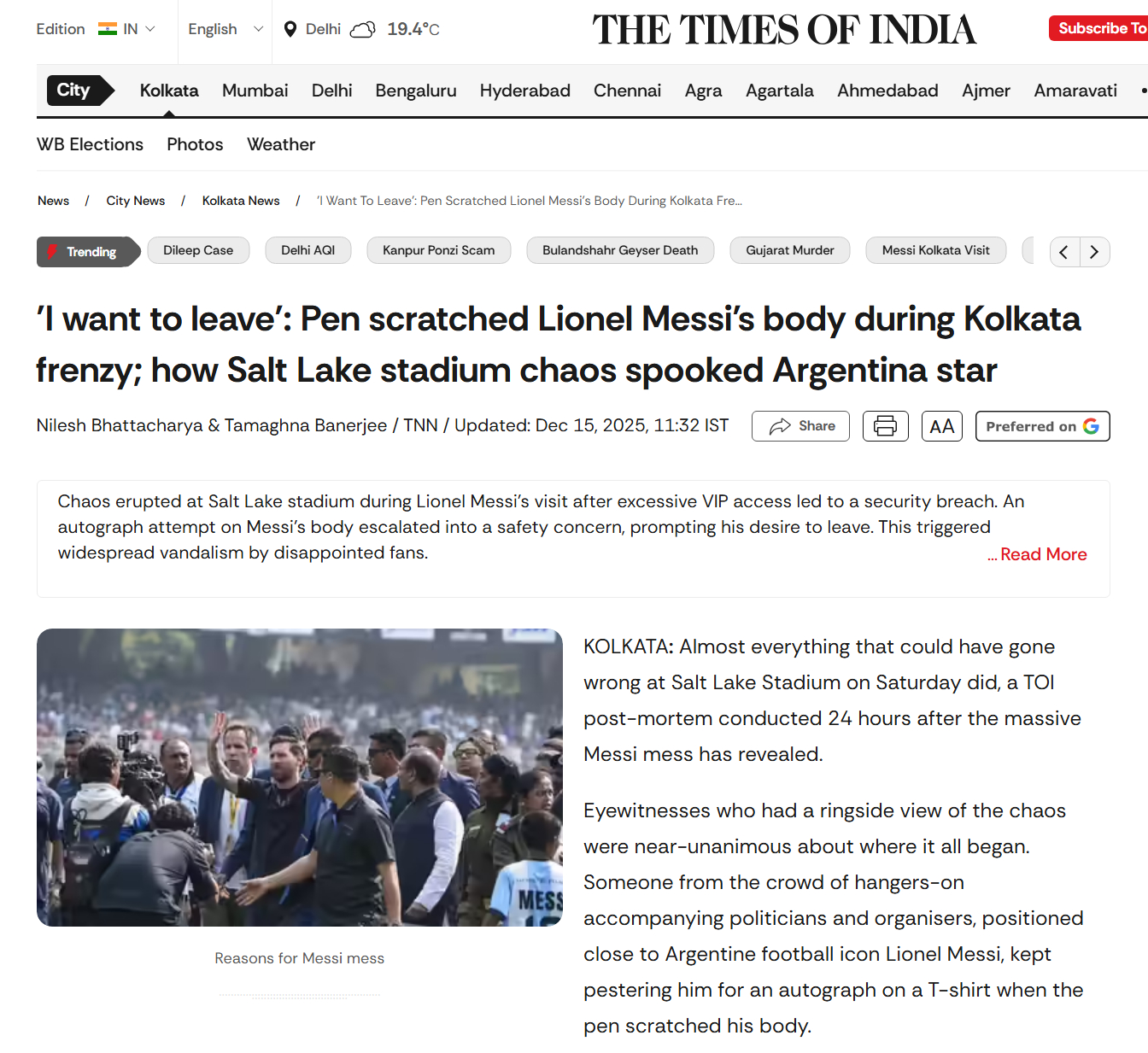 要把這件事情說清楚,還要把時間撥回到兩天前,當時梅西如期抵達了印度行的首站加爾各答,并出席了在鹽湖體育場舉行的球迷見面會。在一堆人的簇擁之下,梅西熱情地和場邊的球迷打著招呼,但不知道是什么原因,在亮相僅僅10分鐘后,梅西和他的團隊便提前退場,草草結束了這次活動。按照印媒給出的說法,是由于現場管理太過混亂,出于安全角度考慮,梅西才被迫離場。