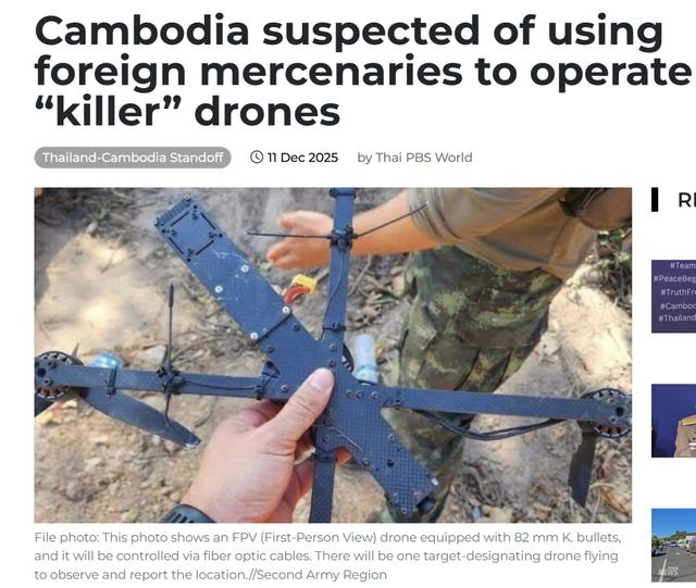 一位不愿意透露姓名的泰國前線官兵接受媒體采訪時稱,他們非常清楚柬埔寨軍方無人機飛手的操作水平如何。在這種復雜的地理環境中,柬埔寨的飛手還能夠判斷出較為開闊的路線,制定清晰的飛行路徑,且在飛行過程中避開復雜的樹林區域,精確擊中目標,這些似乎并不是柬埔寨人能做得到的。所以泰國高層也懷疑,真正操作這些光纖無人機的可能是“某國”的雇傭兵。
