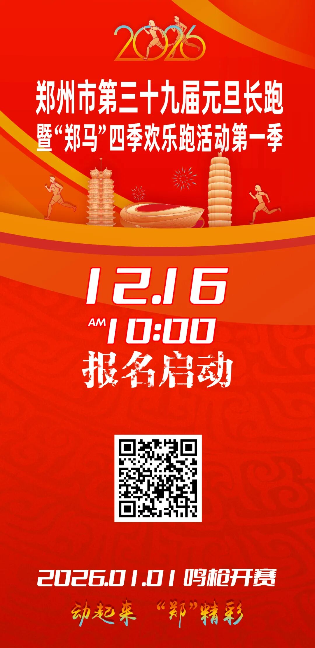 為深入貫徹落實全民健身國家戰略,扎實推進鄭州市全民健身事業高質量發展,進一步激發全市干部群眾以奮發進取、昂揚向上的精神面貌迎接新年的到來,2026年鄭州市第三十九屆元旦長跑暨“鄭馬”四季歡樂跑活動第一季將于2026年1月1日上午9時10分在鄭州奧林匹克體育中心北門(長椿南路與丹水大道交叉口西)鳴槍起跑。屆時,萬余名市民群眾將以奔跑的姿態共同迎接2026年新年的到來。