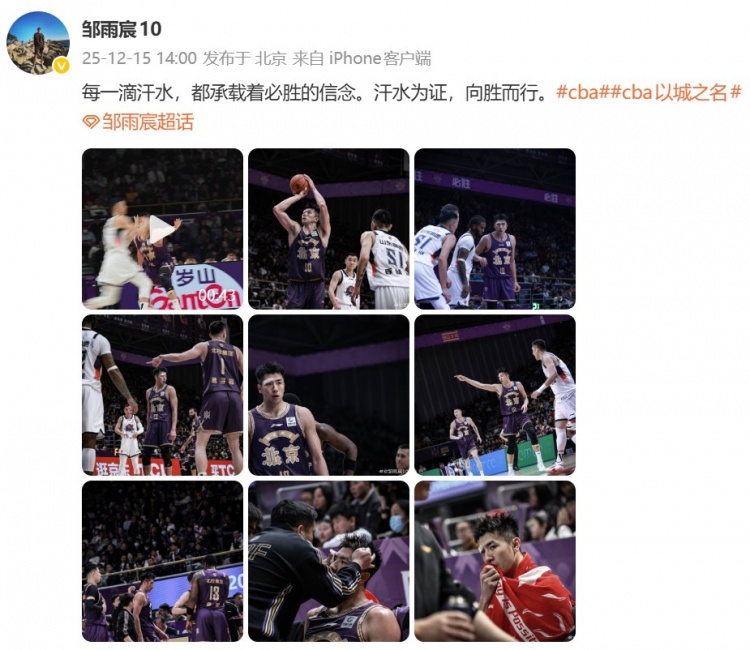 2025 年 12 月 15 日,北控男籃隊長鄒雨宸在個人社交平臺更新動態,曬出一組賽場與訓練照,配文 “每一滴汗水,都承載著必勝的信念。汗水為證,向勝而行”,引發球迷熱議。照片中,既有他眉骨帶傷拼搶的堅毅瞬間,也有訓練后渾身濕透的專注身影,這滴汗水既是賽場拼搏的印記,更是他跨越傷病、重返巔峰的信念見證。