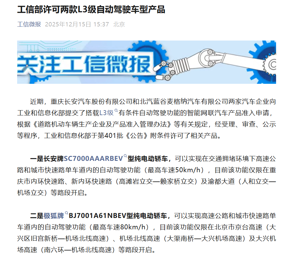 12月15日,兩款L3級(jí)自動(dòng)駕駛車型獲工信部許可,分別為長(zhǎng)安深藍(lán)SL03與極狐阿爾法S6,這兩款車將率先在特定路段開啟有條件的L3自動(dòng)駕駛試點(diǎn)。