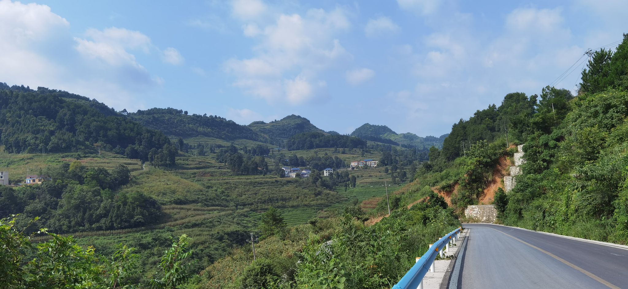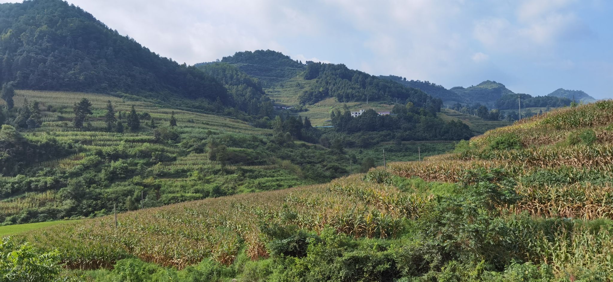 車子在起伏的大山里蜿蜒盤旋,時上時下,道路曲折,青山滿野,莊稼遍地,溝坎縱橫,大梁縱深,群山高聳,白云悠悠。