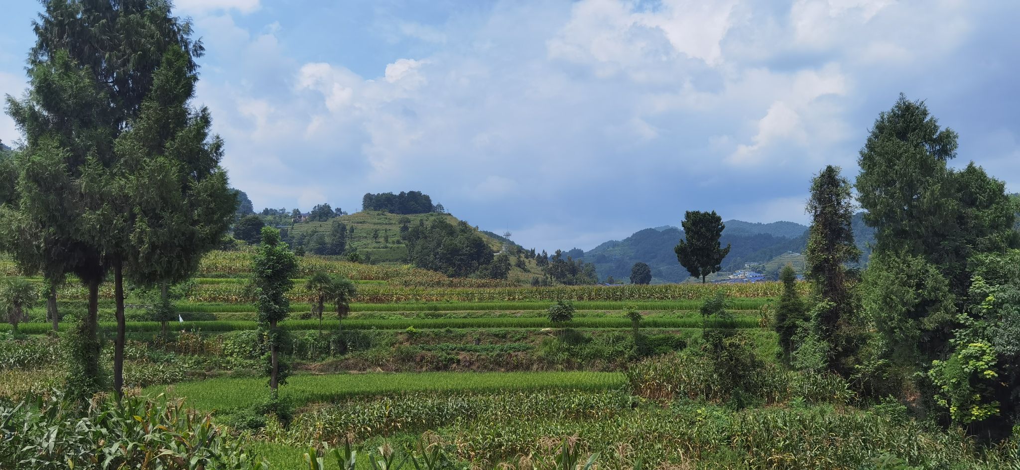 一眼望不到邊,大概好像是平的,都被莊稼掩蓋了,遠處有山,偶有青松站在山岡之上,與我兩兩相望,遙遙相對。
