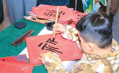 6歲的截癱患兒周周(化名)撥動輪椅車輪,在展廳內興奮地靈活穿梭。在中國康復研究中心北京博愛醫院的書法療愈展臺前,他主動提起毛筆,在紅紙上工整寫下隸書“福”字送給記者,“我練書法一年半了,軟筆硬筆都會!”