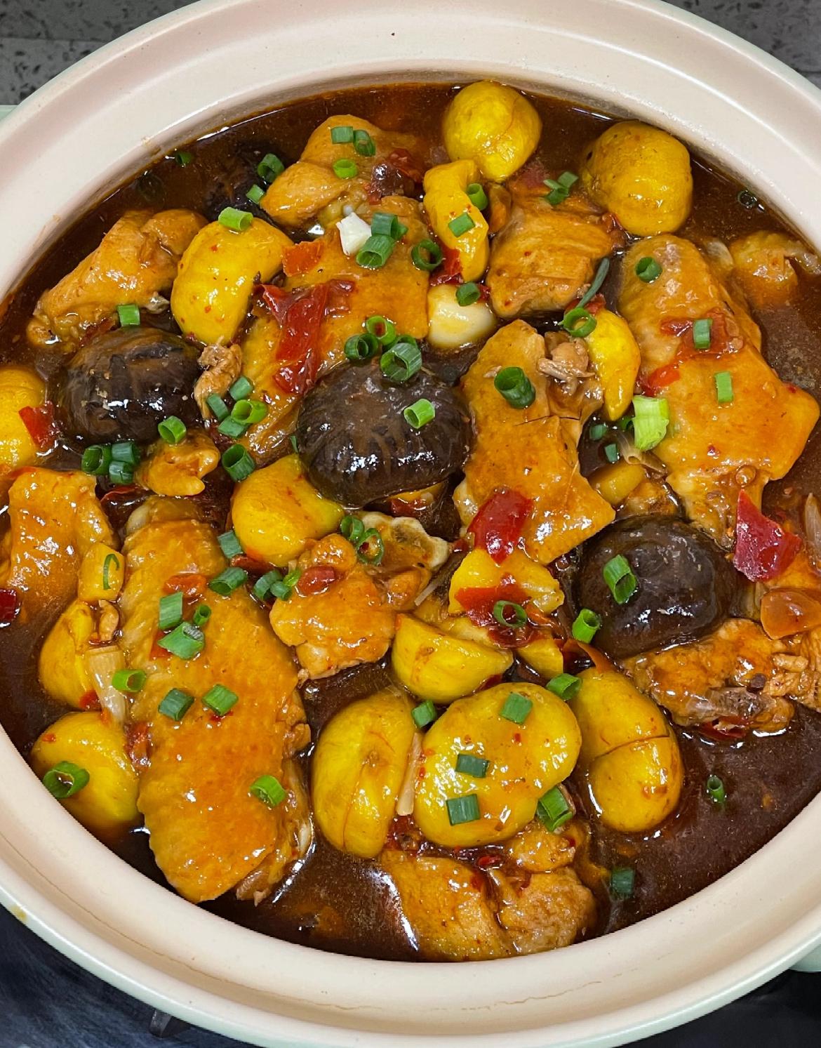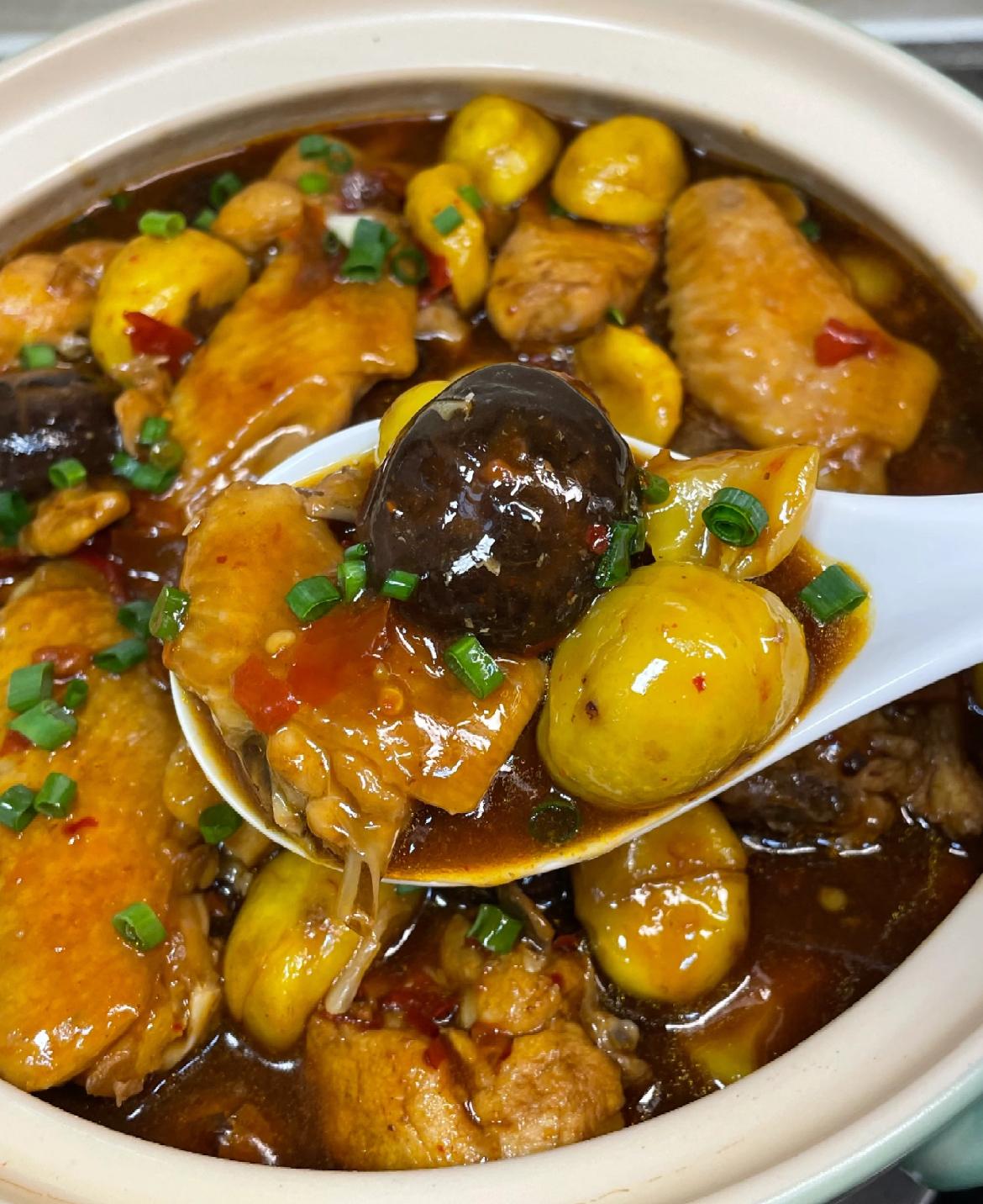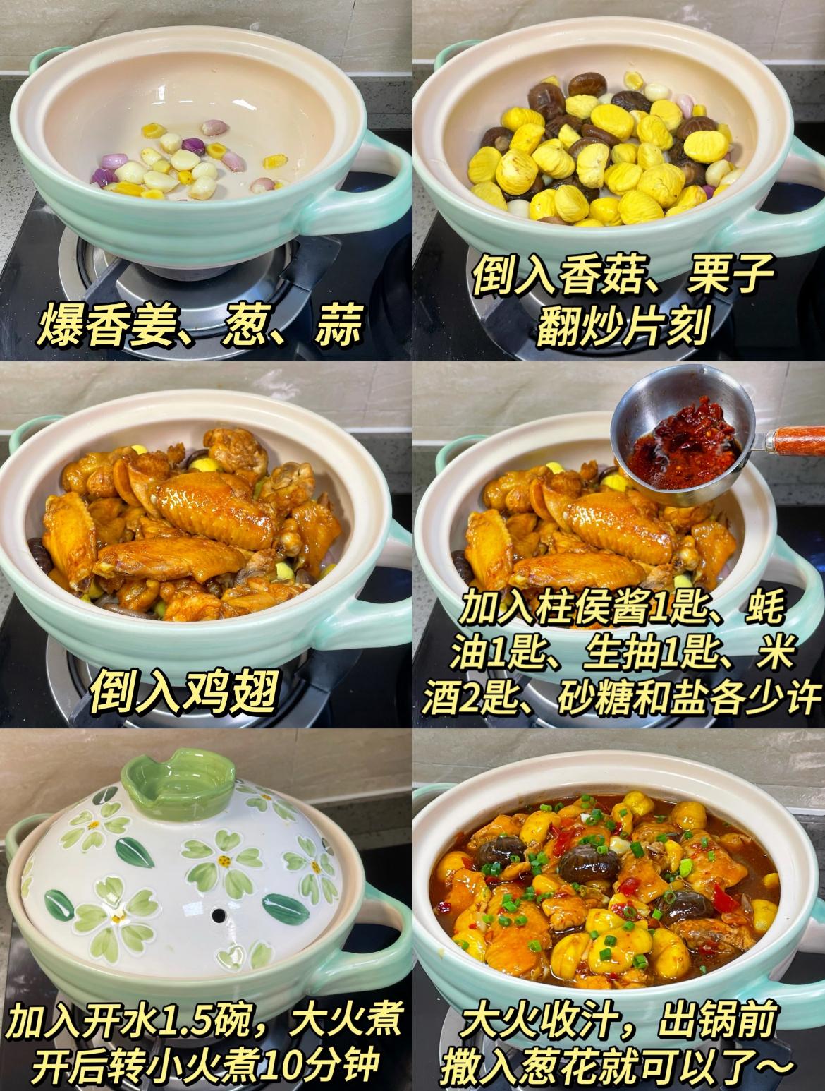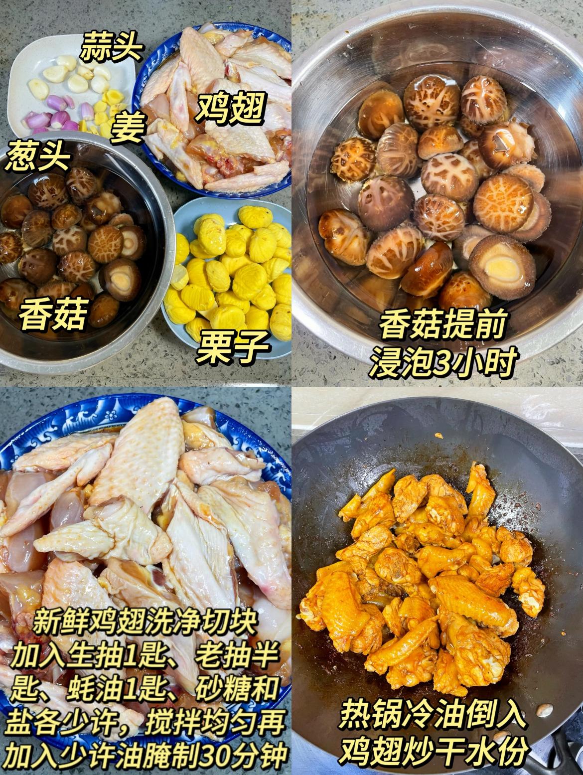 雞翅中 8-10個、香菇 6-8朵、新鮮栗子 150克、姜 3片、大蒜 3瓣、小蔥 2根