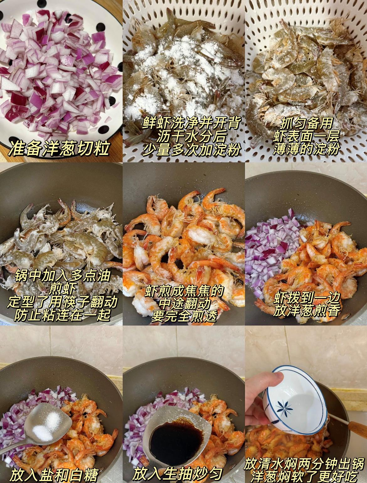 鮮蝦 300克、洋蔥 半個、淀粉 3-4勺、生抽 2勺、白糖 1小勺、鹽 少許、清水 小半碗、食用油 適量