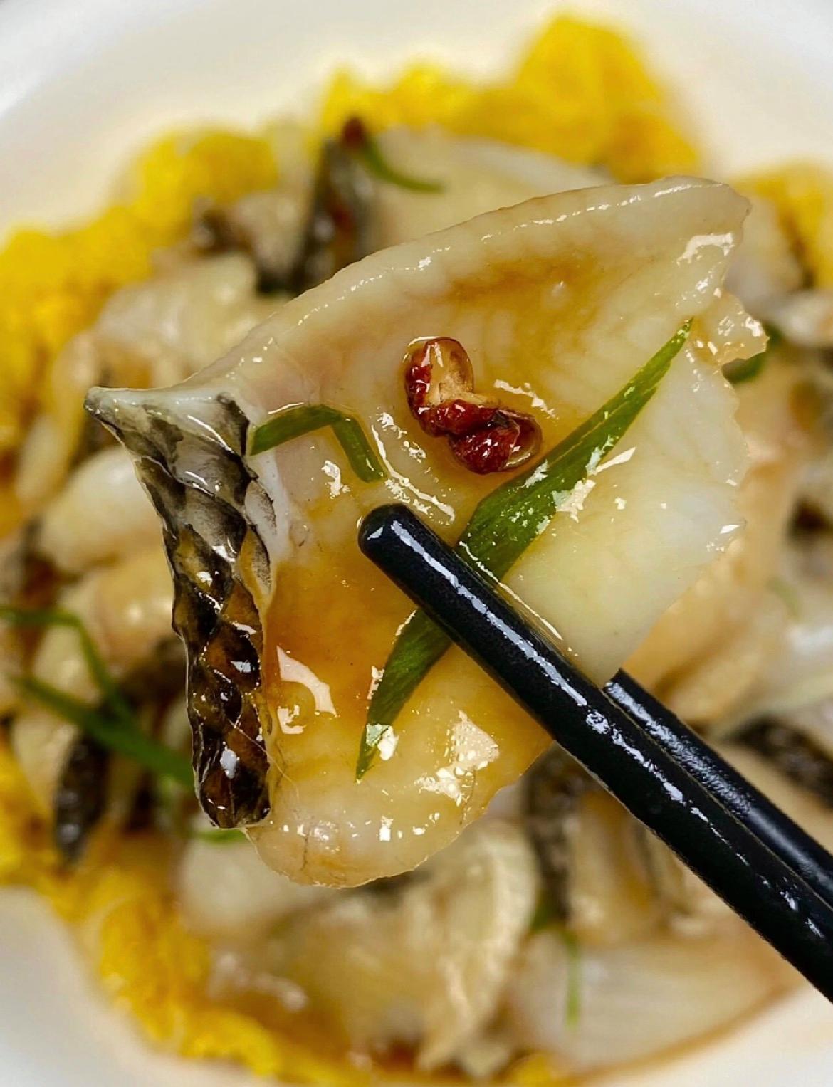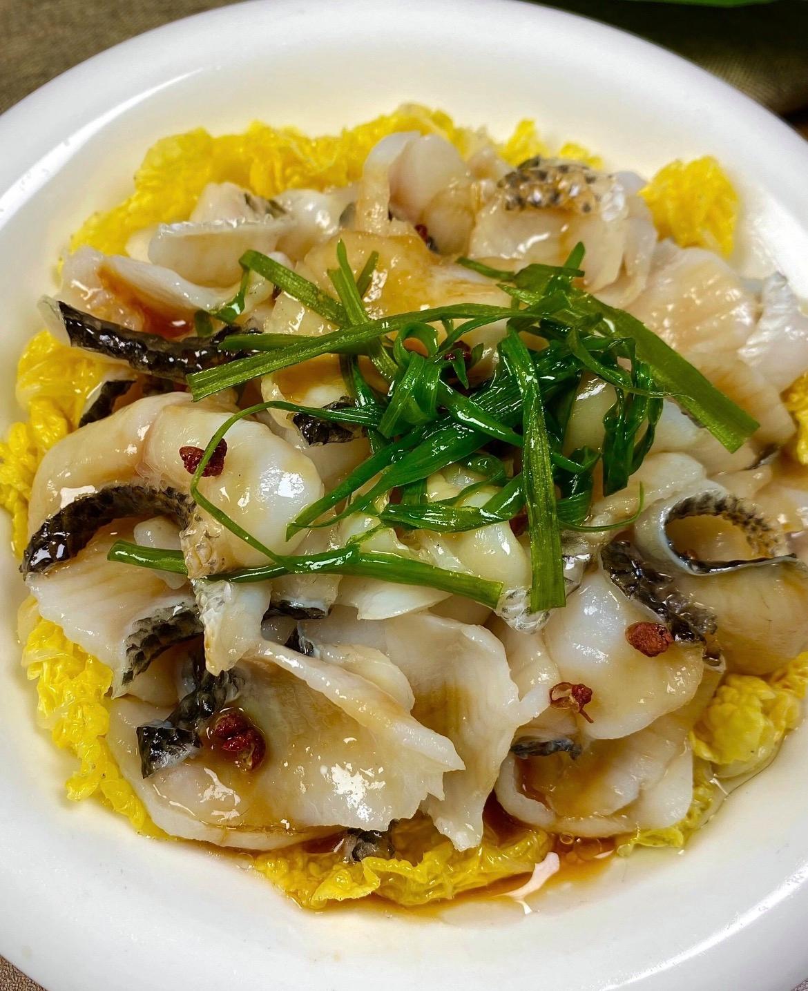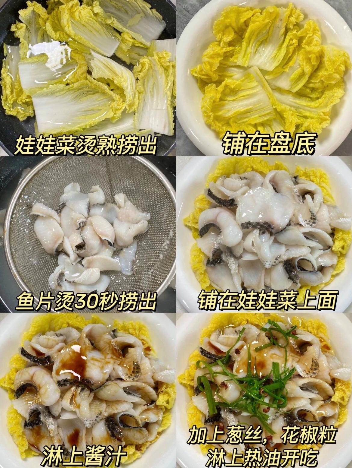 2、同一鍋水中保持微沸,放入魚片燙約30秒至變色卷曲,立即撈出,鋪在娃娃菜上。