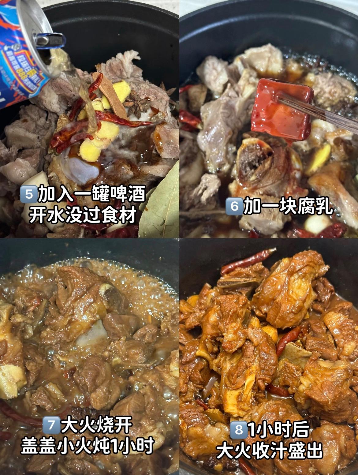 豬骨 1000克、啤酒 1罐、開水 適量、蔥段、姜片、料酒 1勺、大蒜3瓣、八角2個、香葉2片、桂皮1小塊、花椒1小撮、干辣椒3-4個、冰糖幾粒、生抽2勺、老抽1勺、蠔油1勺、腐乳1塊