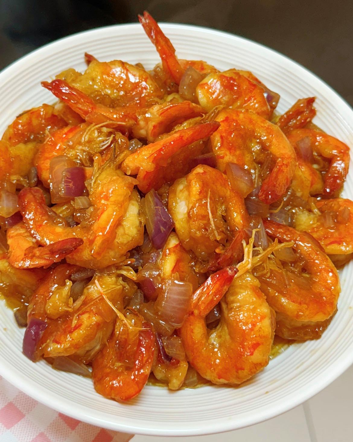 4、倒入小半碗清水,轉中火燜燒約2分鐘,讓蝦充分吸收湯汁,洋蔥軟糯入味,最后大火略微收汁即可出鍋。