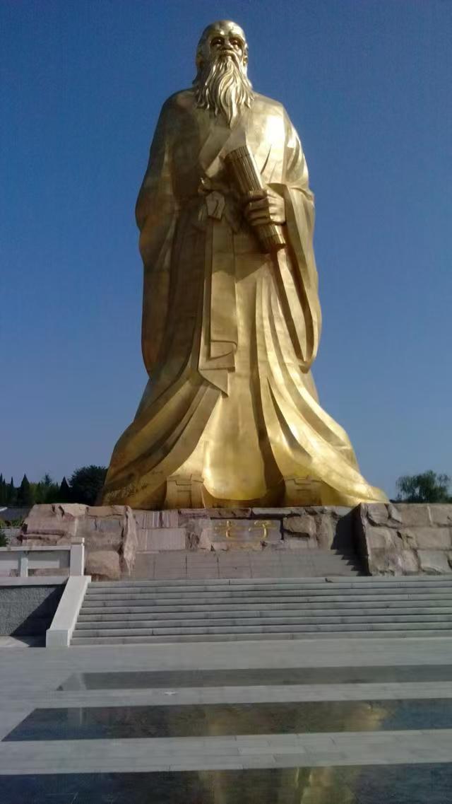 踏入景區大門,最先映入眼簾的便是老子圣像。函谷關老子圣像于2011年建成,主體工程采用紫銅鍛造貼金工藝制作,圣像總高度28.09米,總重量達60噸。該工程總投資2588萬元,貼金工藝消耗黃金33公斤,成為國內罕見的大型貼金雕塑。作為《道德經》誕生地的文化象征,圣像與函谷關歷史遺跡共同構成以軍事文化和老子文化為核心的人文景區。圣像立于高臺之上,駐足仰望,恍惚間,似能聽見兩千多年前,老子騎著青牛緩緩入關,守關吏尹喜執禮相迎,懇請他留下智慧真言的聲響。