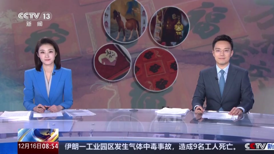 北京故宮文化發展有限公司 楊舒涵:這款福桶里面有對聯,有紅包,還有財神門神。還有跟馬相關的古畫印刷品,可以擺放在家里。靜電貼不需要膠水,拿下來直接貼在玻璃上就可以了。