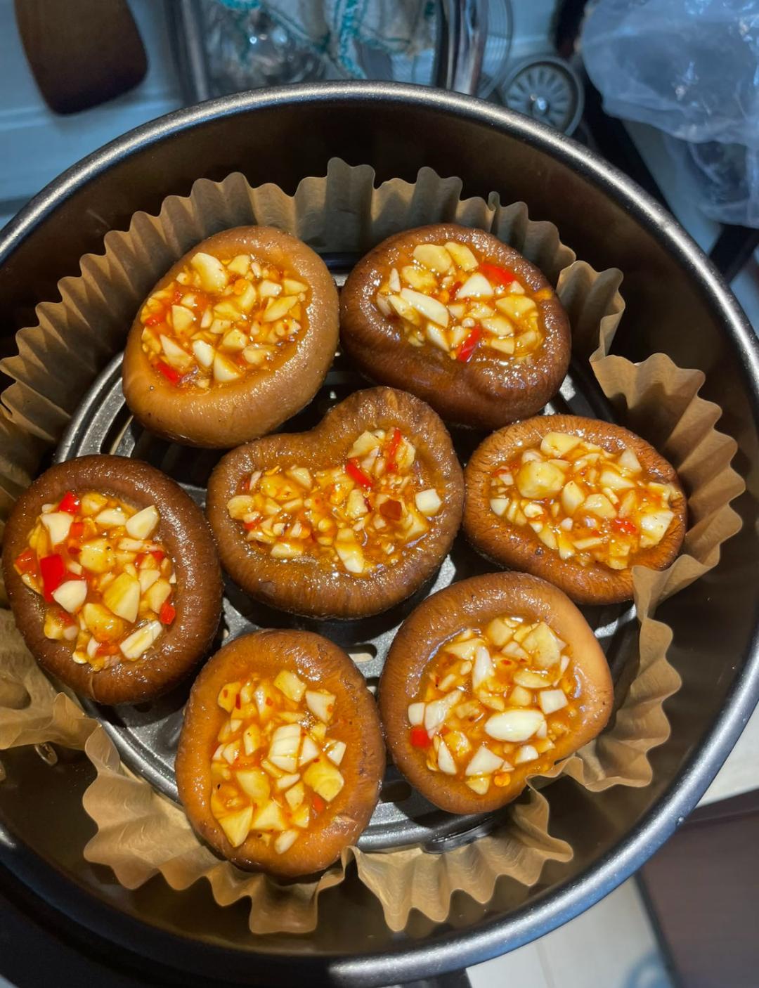 新鮮香菇洗干凈,去掉棍棍舀點(diǎn)餡兒鋪進(jìn)香菇的小碗兒里空氣炸鍋200度8分鐘/180度10分鐘自己把握,聞到蒜快烤糊的味兒就停餡兒:蒜末+食用油+蠔油 拌勻??以上基礎(chǔ)版,我還加了點(diǎn)六婆辣椒面,一點(diǎn)兒生抽,能吃辣的可以加點(diǎn)小米辣碎,加什么完全可以自由發(fā)揮