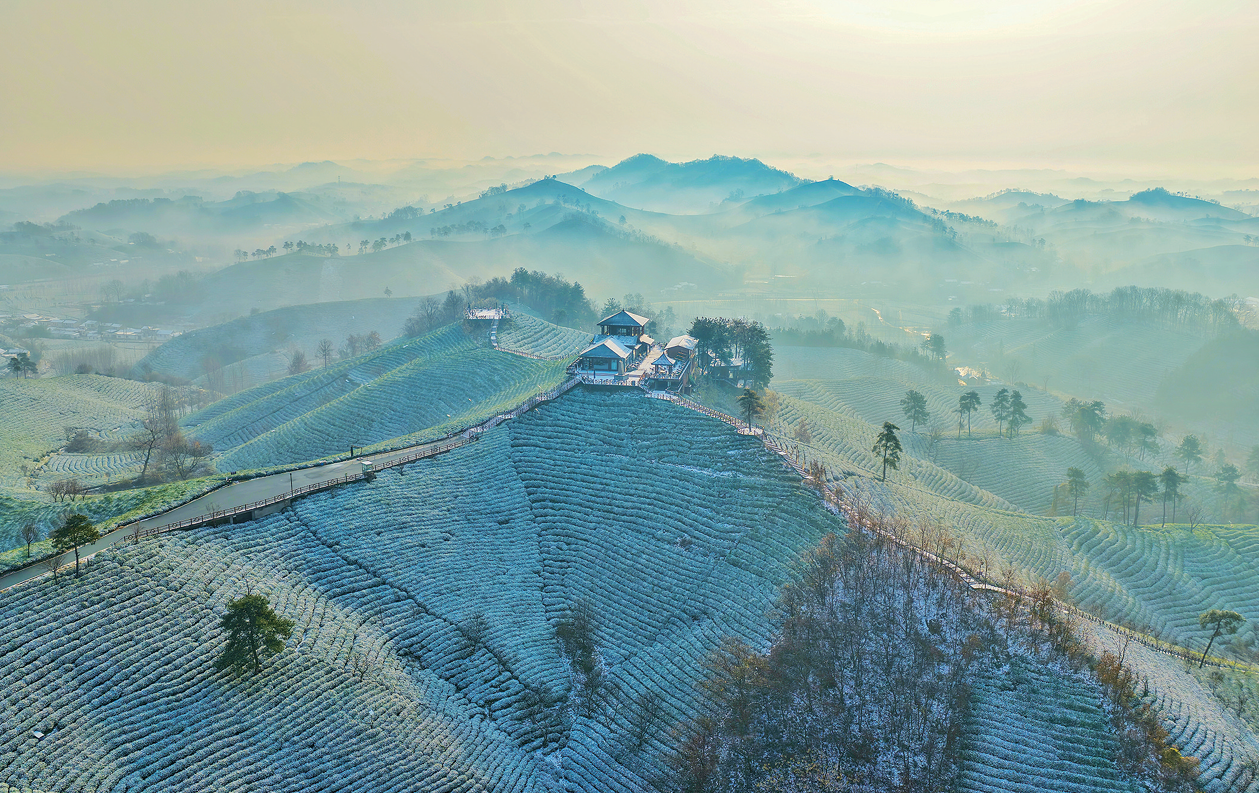 12 月13日,雪后初晴。在信陽市浉河區(qū)文新茶村,皚皚白雪覆蓋層層疊疊的“茶梯”,墨綠茶樹戴上晶瑩“雪帽”,云霧繚繞間紅瓦民居若隱若現(xiàn),繪就一幅冬日水墨畫卷。