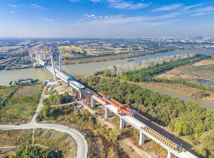 2025年11月20日,中鐵建大橋局施工機械在滬渝蓉高鐵江都段最后一榀箱梁架設現場作業(無人機照片)。新華社發(任飛攝)