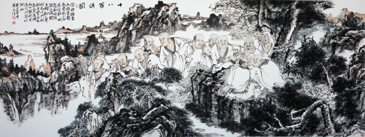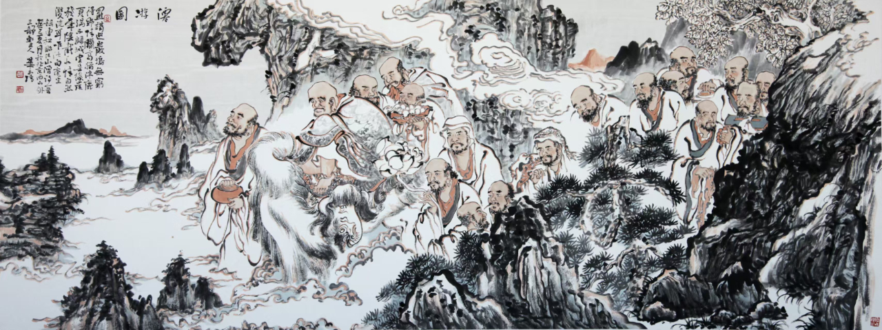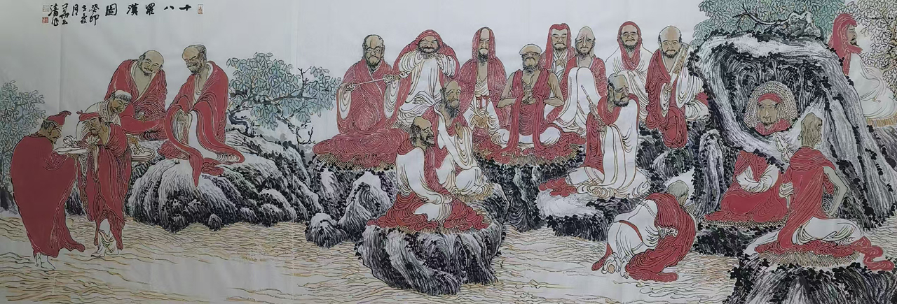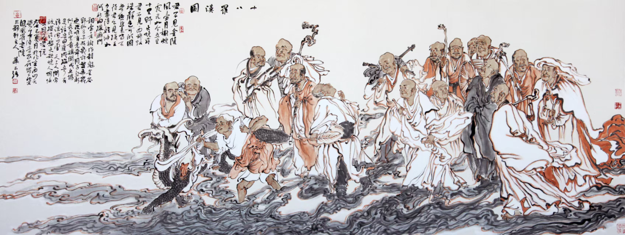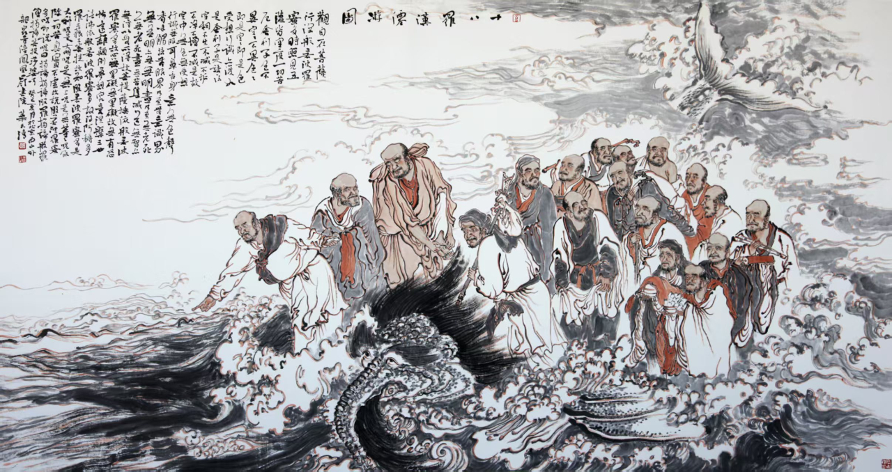 那《十八羅漢圖》里,朱紅袈裟是燒透的晚霞,素白僧衣是裁碎的云絮。羅漢們或捧缽聽泉,或倚石論禪,眉宇間的褶皺是歲月的掌紋,指尖的念珠是時光的漣漪。你看那巖間隱坐的尊者,光暈裹著他如裹月色,身旁的松針垂露,每一滴都懸著一個寂靜的禪意;還有那踏浪而行的群像,墨色的浪濤是凝固的驚雷,羅漢們的衣袂翻飛如燕,似要銜走滿幅的風。這哪里是畫,是三百六十個呼吸在宣紙上的輕顫,是佛性與人性揉碎后織就的錦緞。