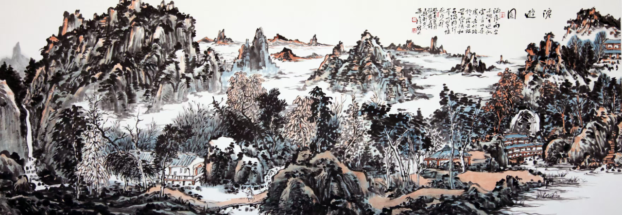 再看他的山水,是把天地縮成了掌心里的煙霞。山巒以積墨為骨,如青銅鼎彝般沉雄,淡墨皴出的云氣是繞指的輕紗,焦墨劈出的崖壁是劍刃的寒光。銀粉混赭石的飛瀑,是銀河在山間崩裂,濺起的霜花里藏著星子的碎光;石青點染的夏木,是翡翠在巖間流淌,每片葉尖都墜著盛夏的心跳。亭臺是時光的郵筒,飛檐翹角里封著古人的唱和;茅舍是歲月的茶盞,炊煙裊裊間溫著今人的鄉愁 —— 他把《千里江山》的壯闊與《溪山行旅》的深邃,熬成了宣紙上的一盅陳釀,飲之則醉,醉則忘言。